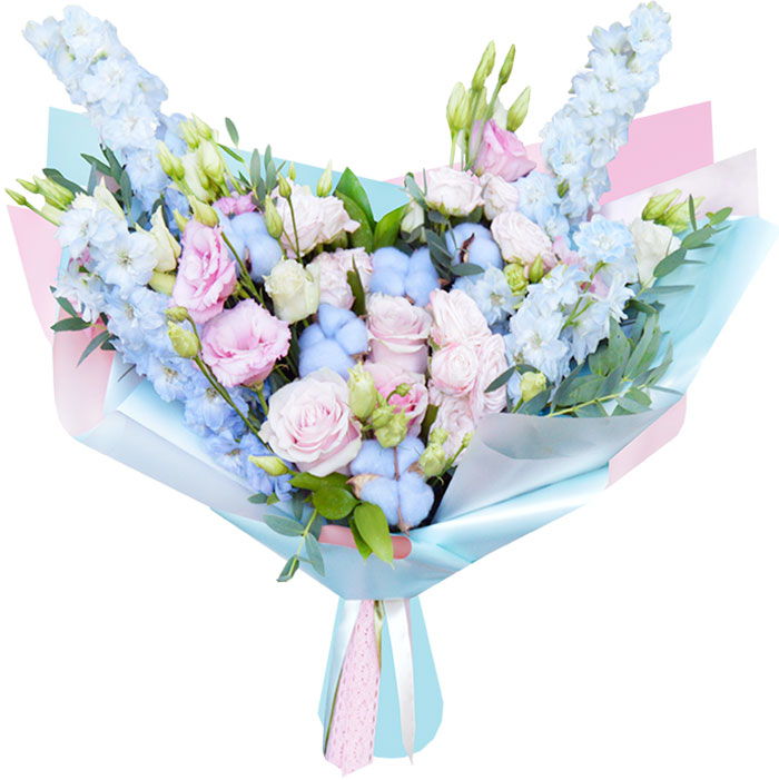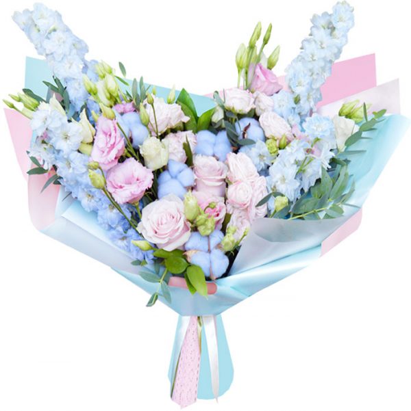 Нежный букет из дельфиниумов,эустомы,роз и хлопка….Сочетание просто изумительное….
