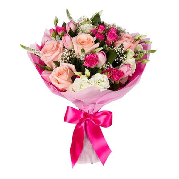 Нежный букет для романтичной и сентименальной… состав: 5 крупных роз 3 куст.розы 3 эустомы 9 тюльпанов зелень оформление